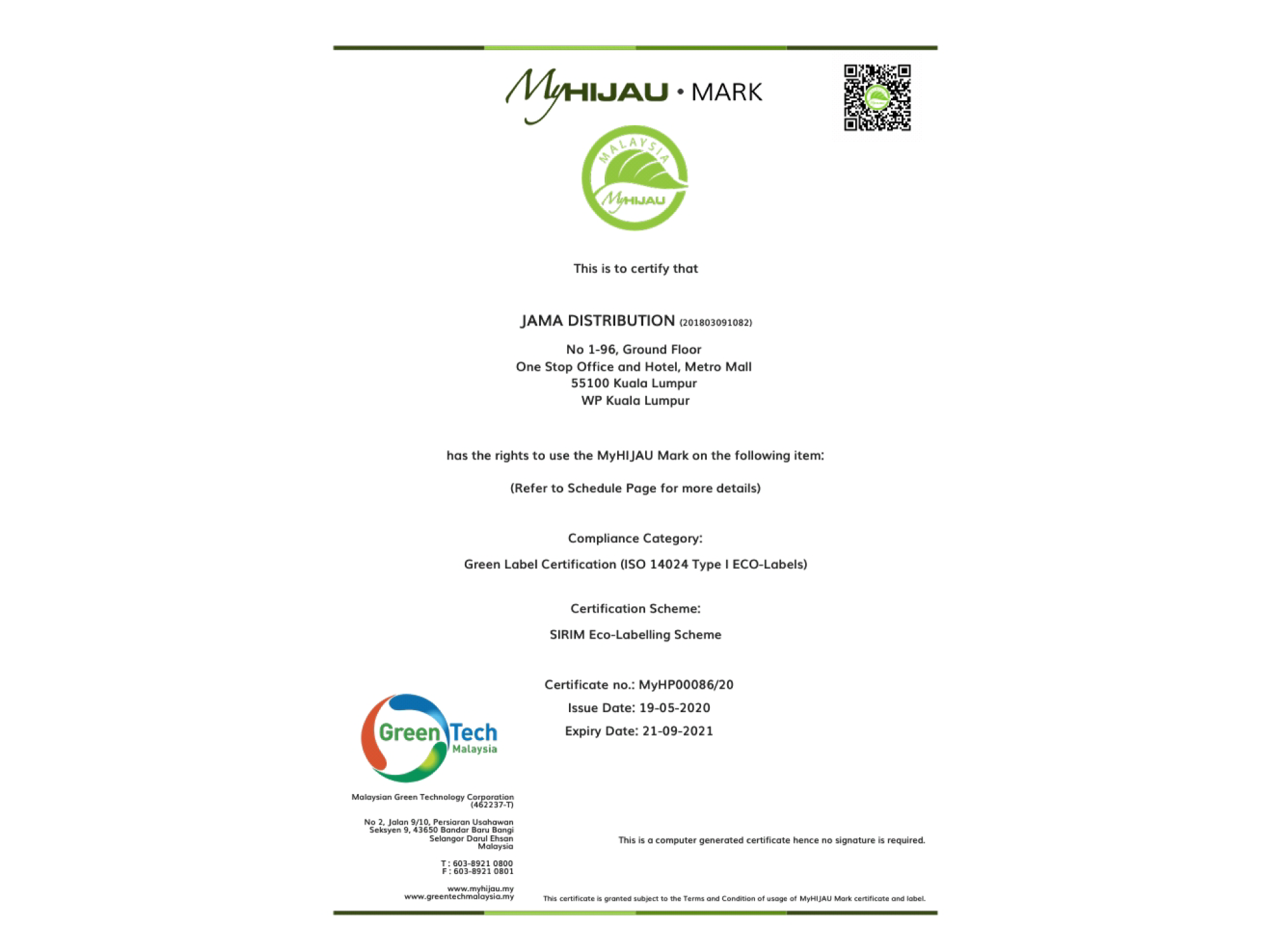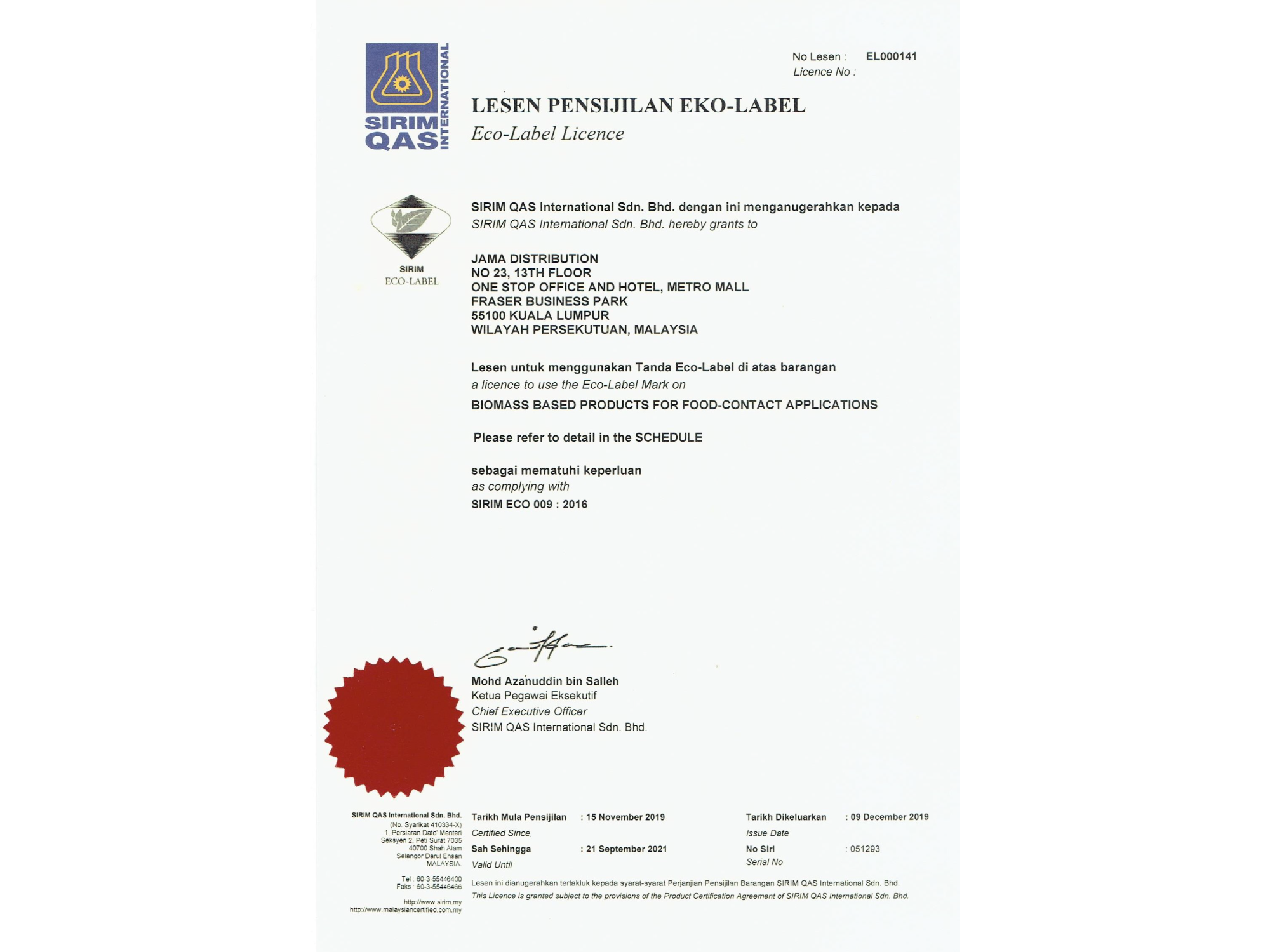 Certified with SIRIM EL000141 Eco-Label Certification,