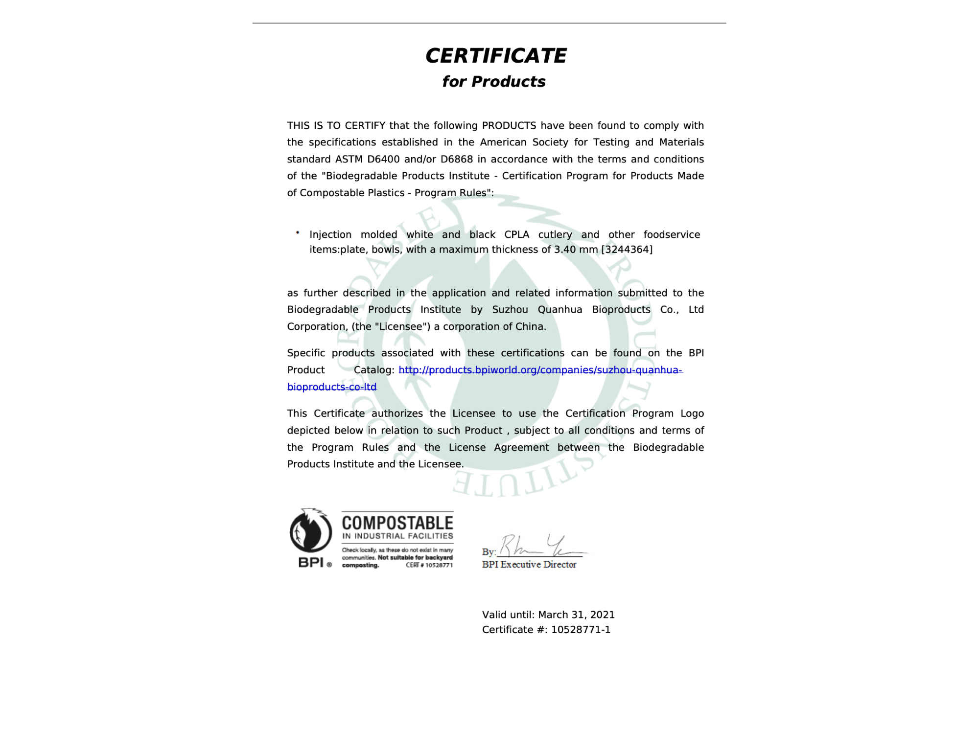 BPI - Biodegradable Products Institute Certification Number #10528539